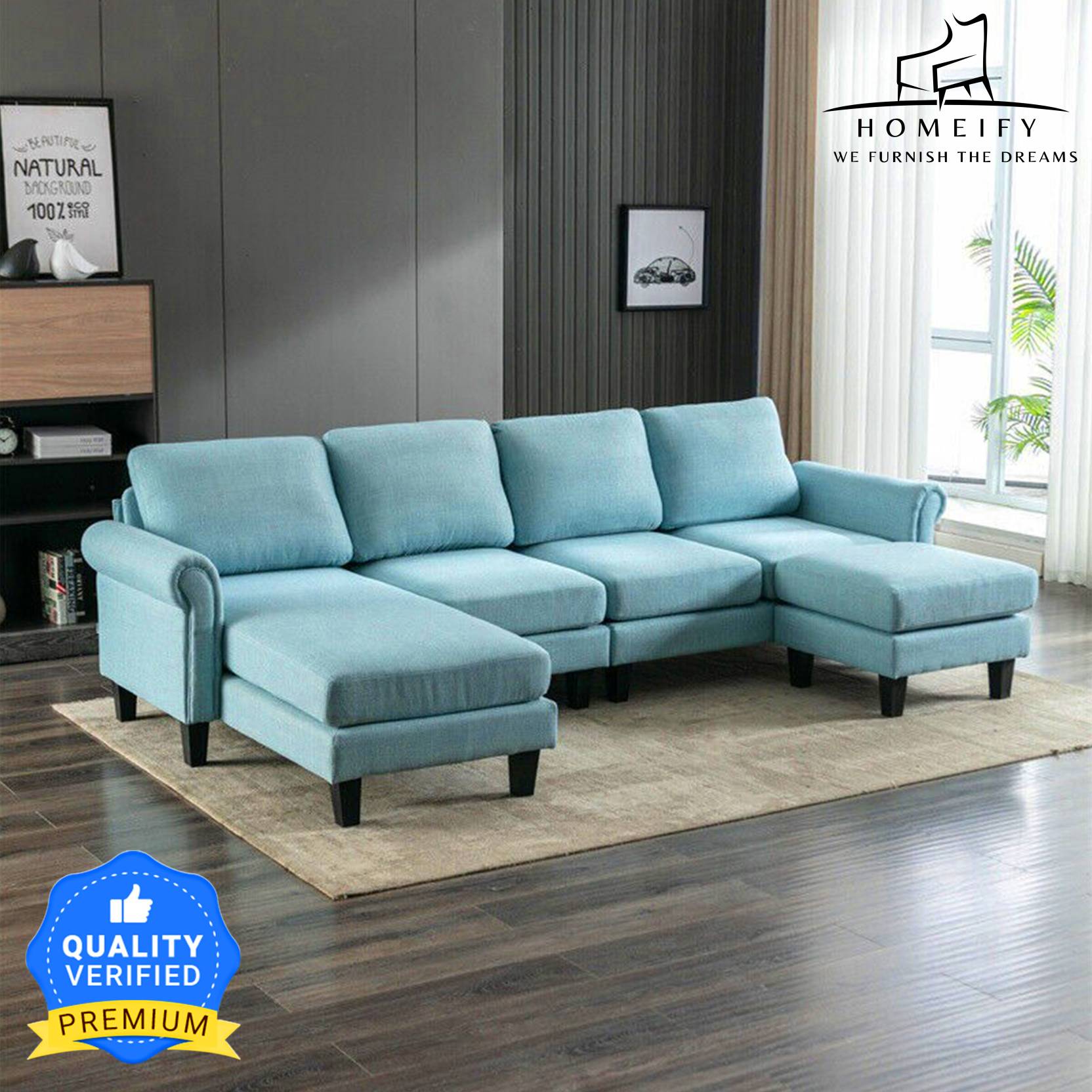 Homeify Reba 6 Seater Fabric Sectional Sofa with Ottoman for Living Room Fabric 3 + 2 + 1 Sofa Set (Blue, Pre-assembled)